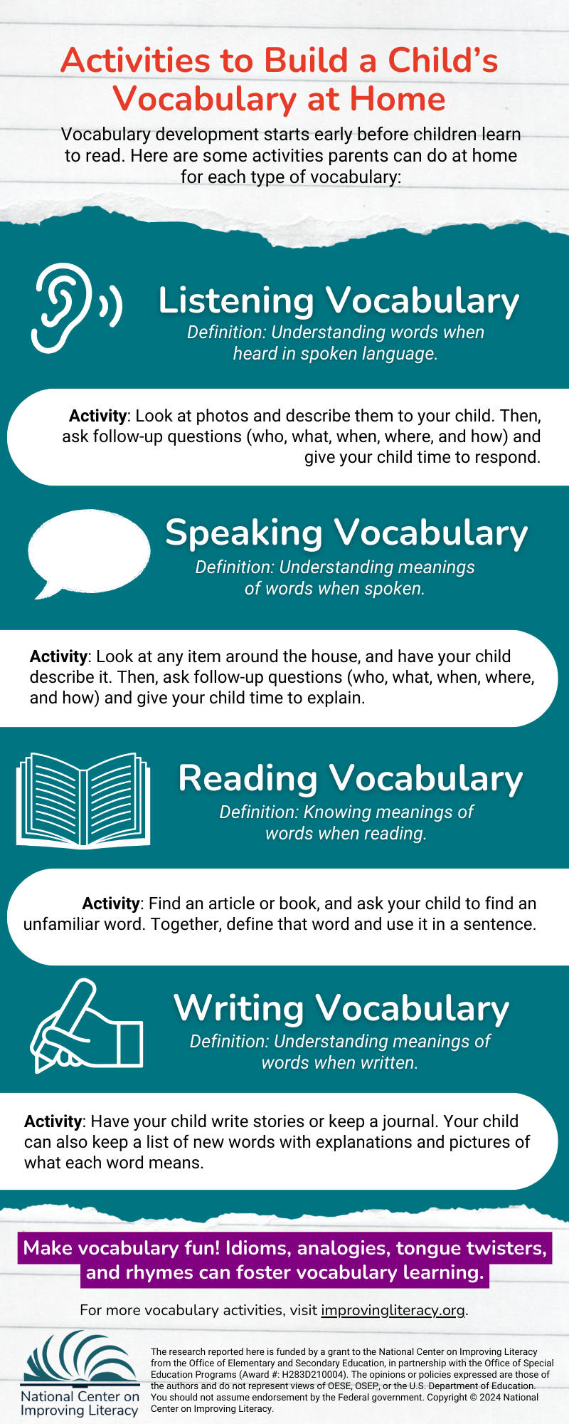 Here are the four types of vocabulary, with easy activities parents can do with their child at home: