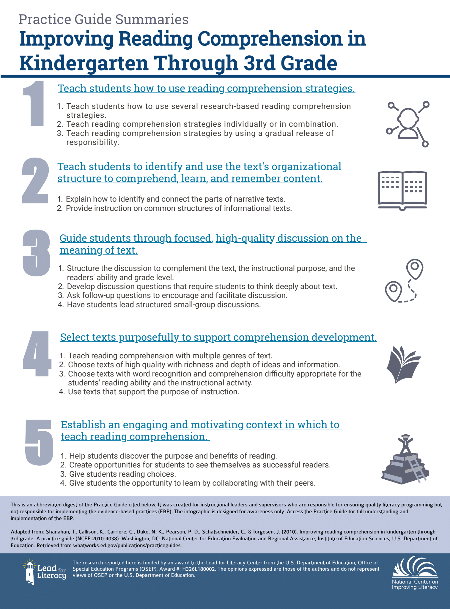 The IES practice guide on Improving Reading Comprehension in Kindergarten Through 3rd Grade provides the following five specific recommendations to successfully improve reading comprehension for young readers: