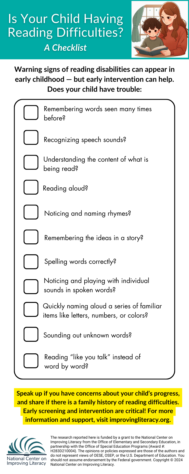 National Center on Improving Literacy. (2017). Is Your Child Having Trouble Reading? Warning Signs and a Checklist. https://www.improvingliteracy.org/resource/is-your-child-having-trouble-reading