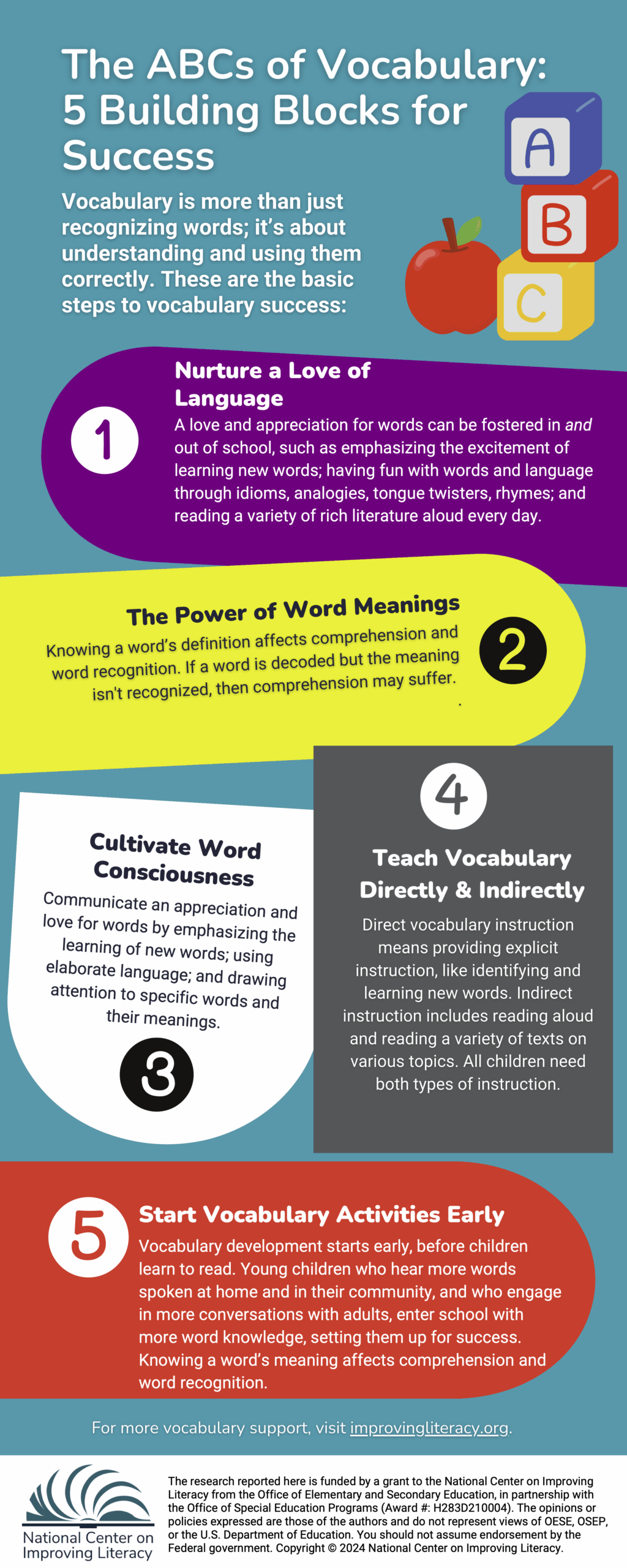 Vocabulary development starts early, before children learn to read. Young children who hear more words spoken at home and in their community, and who engage in more conversations with adults, enter school with more word knowledge, setting them up for success. Knowing a word’s meaning affects comprehension and word recognition.